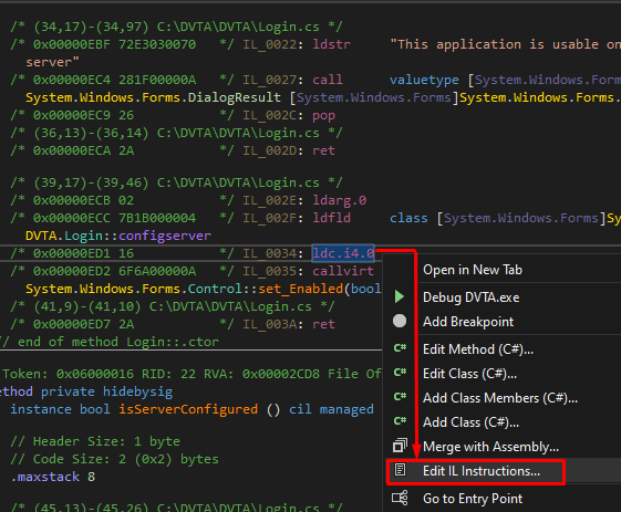 Пользователь щелкнет правой кнопкой мыши на значение ldc.i4.0 и отредактирует инструкции IL, как показано ниже на картинке:
