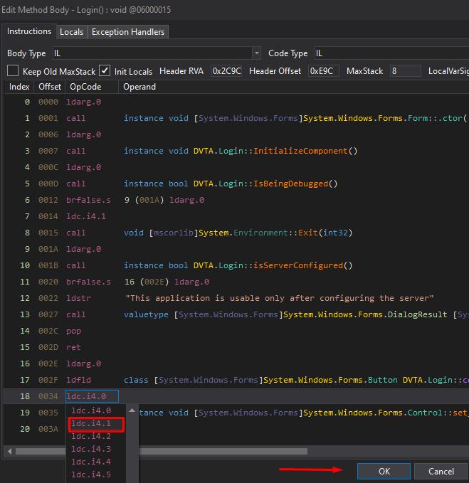 Он откроет еще одно приглашение и правой кнопкой мыши щелкнет на значение ldc.14.0, а затем выберет ldc.i4.1 и нажмет на кнопку «ОК».
