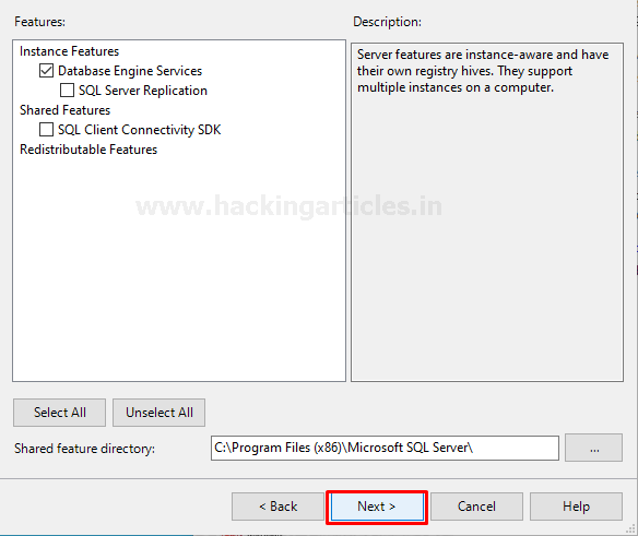 Это окно означает, что все в порядке. Теперь пользователь перейдет к следующему шагу и выберет компонент Database Engine Service, а затем он нажмет на кнопку «Далее» (англ. «Next»).