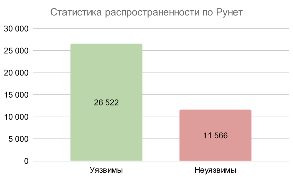 По данным аналитики CyberOK СКИПА за последние 3 месяца, в Рунете обнаружено около 38 тысяч инстансов MS Exchange Server, из которых, согласно публично доступной информации о версиях, более 31 тысячи потенциально подвержены уязвимости, что составляет более 83% от общего числа.