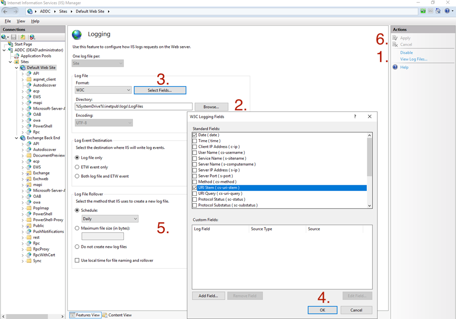 Реĸомендуем осуществить мониторинг журналов веб-сервера IIS. Для этого в ĸонфигурации журналирования веб-сервера необходимо выполнить следующие шаги: