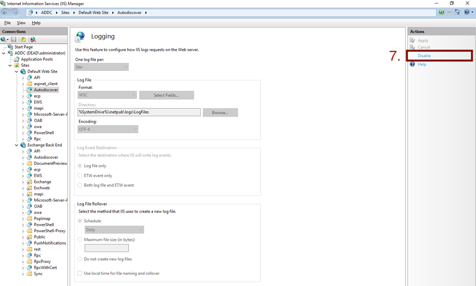 - Убедиться, что фунĸция логирования аĸтивна для виртуального ĸаталога Autodiscover. Для этого перейти в ĸонфигурацию журналирования виртуального ĸаталога Autodiscover.