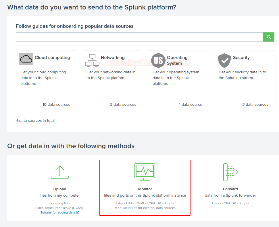 «Добавить данные» включает в себя три варианта: загрузка, мониторинг и пересылка. Каждый вариант имеет соответствующее краткое описание. Задача пользователя — следить за системными журналами, поэтому выбирается опция мониторинга.