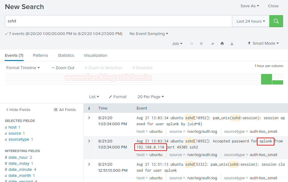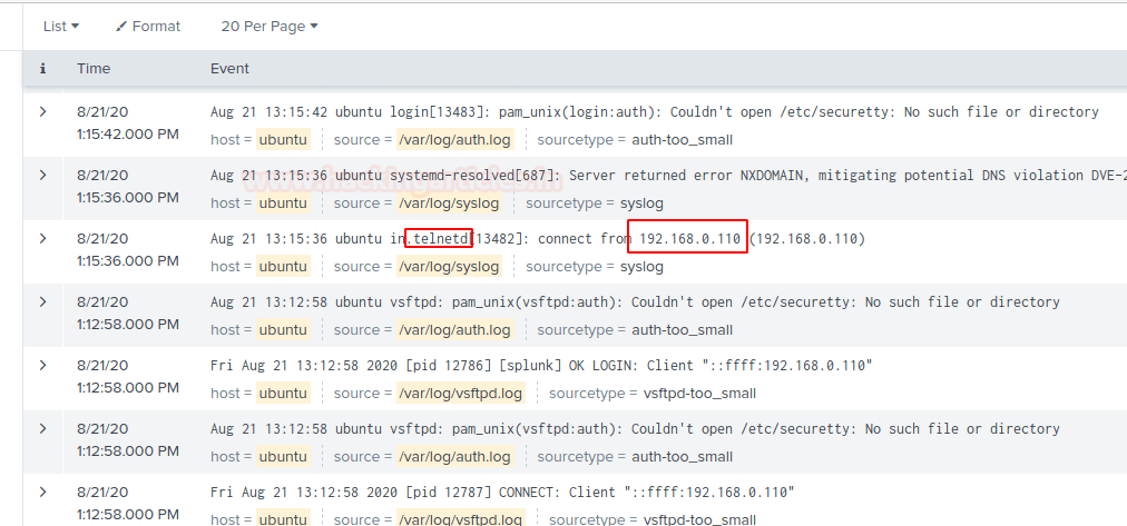 Настало время проверить, что случилось с панелью Splunk. После получения доступа к серверу пользователь вернется на свою панель мониторинга и «сузит» журналы до Telnet на сервере, выполнив запрос telnet.