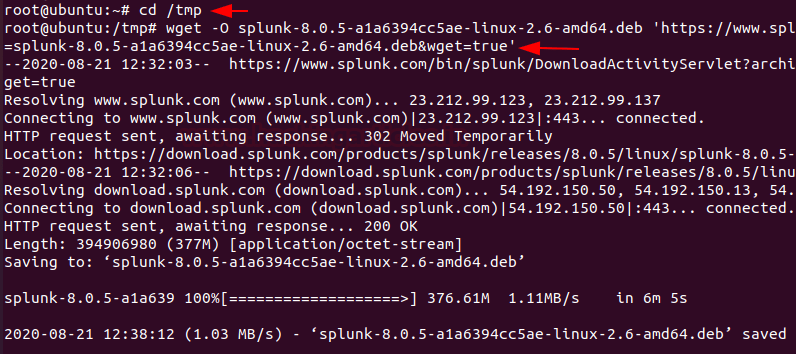 wget -O splunk-8.0.5-a1a6394cc5ae-linux-2.6-amd64.deb 'https://www.splunk.com/bin/splunk/DownloadActivityServlet?architecture=x86_64&platform=linux&version=8.0.5&product=splunk&filename=splunk-8.0.5-a1a6394cc5ae-linux-2.6-amd64.deb&wget=true'