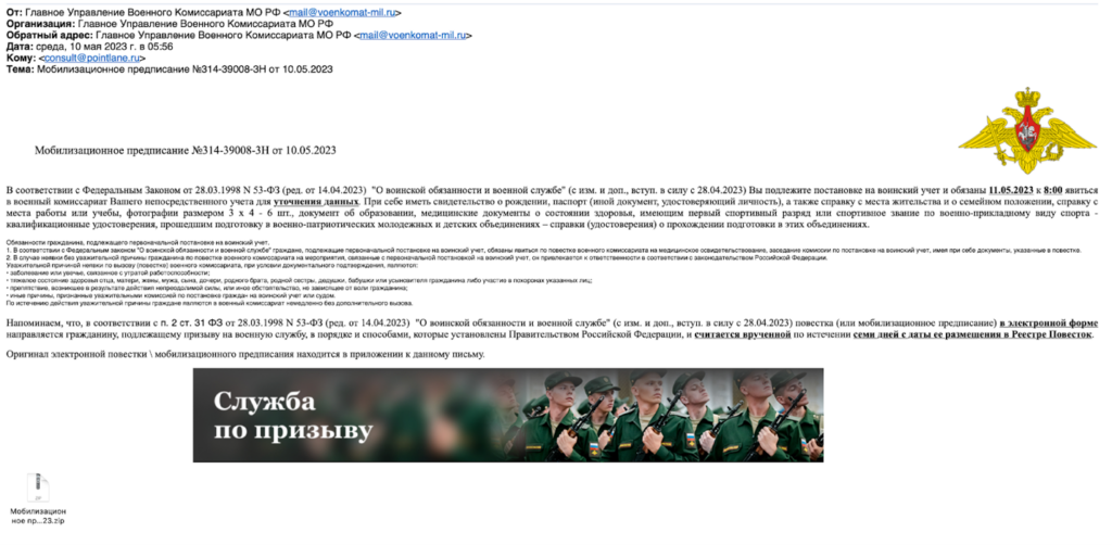 При атаках на рядового пользователя стоит отметить тему мобилизации и фейковых повесток. Пример одной из таких вы можете видеть ниже.