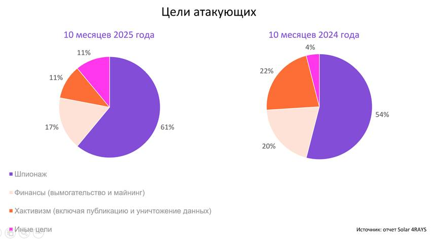 Главной целью профессиональных хакеров в этом году по-прежнему остается шпионаж (61%, + 7 п.п. год к году). Доля финансово мотивированных атак снизилась на 3 п.п. год к году, до 17%, а хактивистских (с громкими политическими заявлениями) — на 11 п.п., до 11%. Это означает, что злоумышленники вместо «громких» атак чаще фокусируются на сложных и скрытных — хотя и публичные инциденты все еще встречаются.