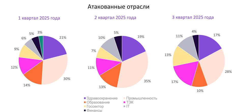 В 3-м квартале хакеры чаще пытались атаковать организации из сфер промышленности (27% сработок сенсоров, -5 п.п. в сравнении со 2‑м кварталом), ТЭК (17%, + 6 п.п.), здравоохранения (17%, -1 п.п.) и госструктур (13%, + 6 п.п.). Чуть меньше заражений было зафиксировано в IT-компаниях (11%), образовательных организациях (10%), кредитно-финансовой отрасли (4%) и телекоме (1%).