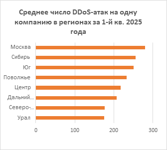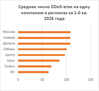 Что касается географического распределения, то по-прежнему большая часть DDoS приходится на Москву. При этом фиксируется небольшой разрыв по среднему числу атак на одну компанию в Москве и других федеральных округах, что говорит об активизации злоумышленников и в других регионах. Второе место занял Северо-Западный федеральный округ — всего за 1-й квартал каждая организация столкнулась по меньшей мере со 108 DDoS-атаками. Вектор переместился туда из‑за наличия в регионе большого количества организаций из нефтеперерабатывающей и газодобывающей промышленности, которые интересуют хакеров.