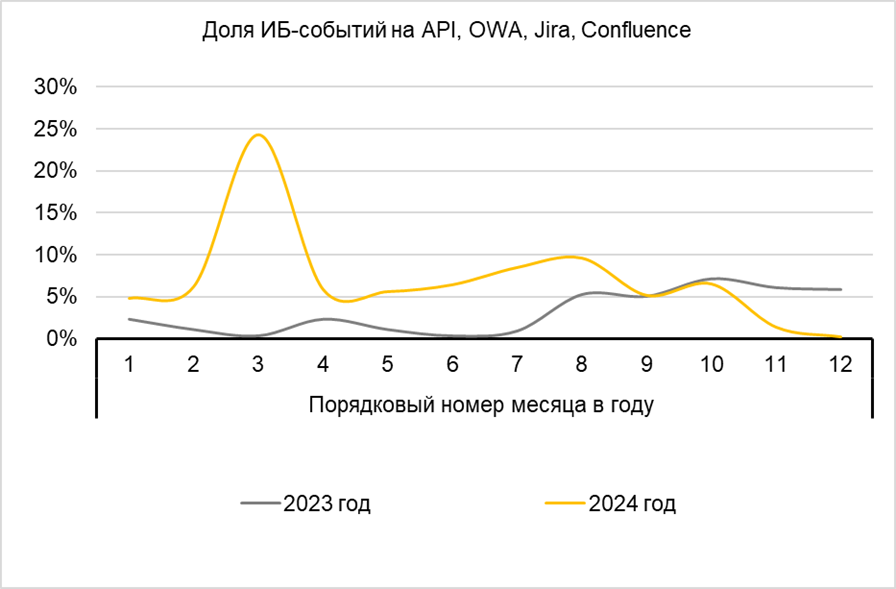 Вместе с этим средняя доля событий ИБ, зафиксированных на API (программный интерфейс для обмена информацией между сервисами, веб-приложениями и ПО), OWA (web-клиент почтового клиента Microsoft Outlook), Jira (сервис для управления проектами) и Confluence (онлайн-система для совместной работы с документами) в рамках аналитики 57 организаций-клиентов сервиса WAF в 2024 году выросла более чем в 2 раза — до 7%.