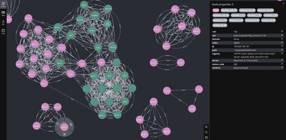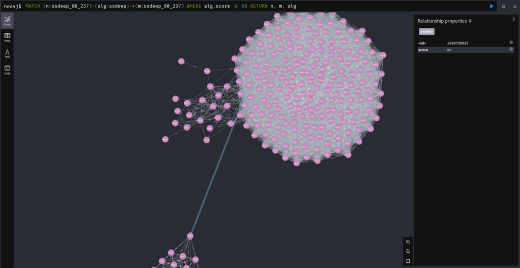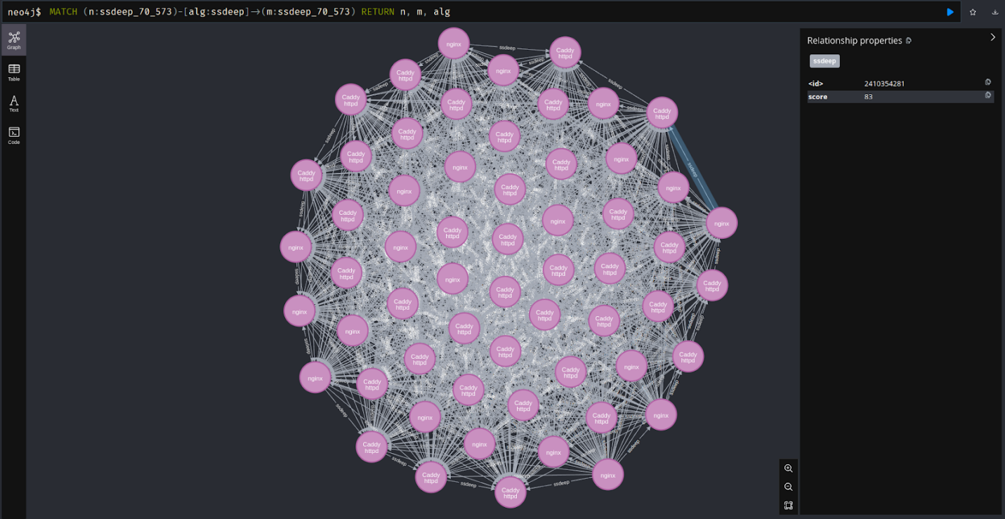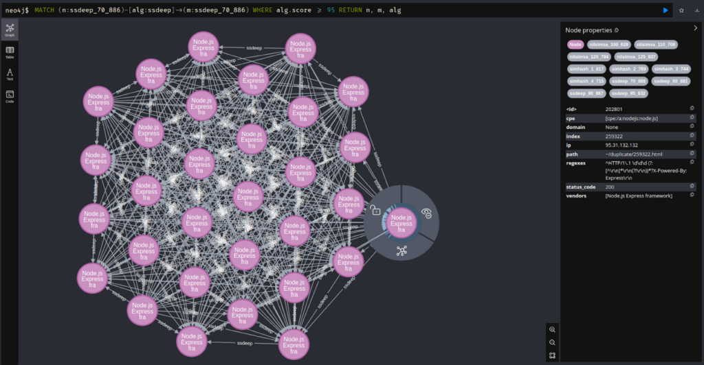 На скрине случайно взятые кластеры. Тут видно, что есть рёбра разных алгоритмов между нодами, а в нодах есть информация о том, к чему они относятся и с какими другими связаны.
