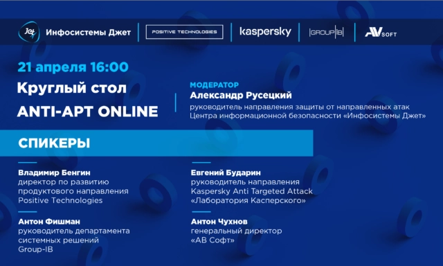 21 апреля в 16.00 состоится круглый стол, посвященный выходу нового обзора Anti-APT решений от компании «Инфосистемы Джет». На онлайн-мероприятии представители Group-IB, Positive Technologies, «АВ Софт» и «Лаборатории Касперского» обсудят тенденции российского рынка Anti-APT, поделятся видением эффективного построения защиты от сложных атак, расскажут о нюансах использования продуктов в режиме удаленной работы и разберут актуальные кейсы применения […]