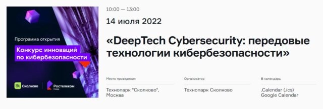 Фонд «Сколково» и «Ростелеком-Солар» приглашают вас 14 июля в 10.00 принять участие в открытии конкурса «DeepTech Cybersecurity: передовые технологии кибербезопасности». Системообразующая компания в области кибербезопасности «Ростелеком-Солар» и Фонд «Сколково» запускают программу инвестиционного развития для технологических команд в сфере кибербезопасности. В ходе данного мероприятия планируется выступление представителей Фонда «Сколково» и «Ростелеком-Солар». Вы сможете напрямую задать вопросы […]