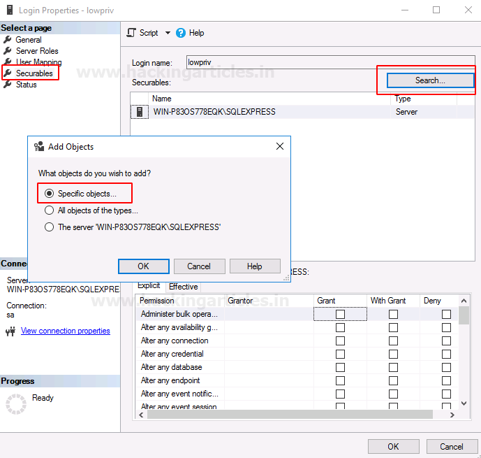 Теперь на правой панели пользователь может заметить, что есть опция, которая называется «Securables». Он нажмет на нее, а затем кликнет на кнопку «Search». После этого откроется диалоговое окно. В диалоговом окне будут предложены три варианта на выбор. Пользователь выбирает «Specific objects» и нажимает на кнопку «ОК».