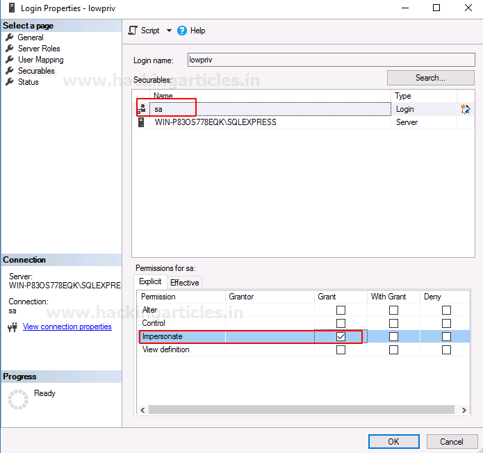 Теперь, если проверить разрешения для пользователя sa, то можно увидеть, что разрешение на выдачу себя за другого пользователя включено.