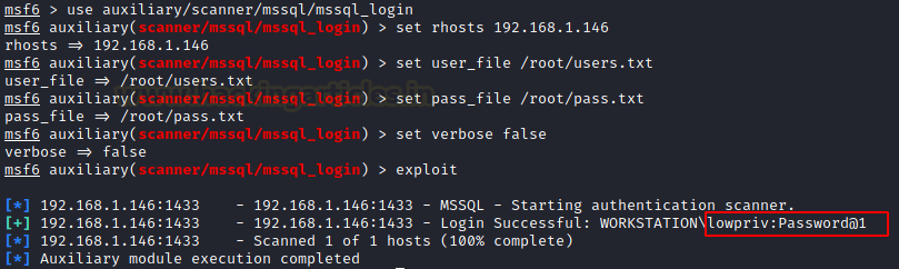 Чтобы произвести эксплойт MSSQL с помощью «Impersonate», сначала нужно найти имя пользователя и пароль. Можно развернуть следующий эксплойт, который будет использовать атаку со словарями и поможет найти учетные данные пользователя: