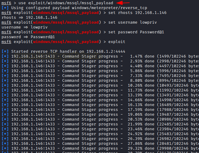 Как можно заметить, теперь у пользователя есть учетные данные. Он проверит, можно ли запустить новый эксплойт «mssql_payload». Если этот эксплойт успешно выполняется сам по себе, это будет означать, что данный пользователь имеет право на это. В противном случае нужно будет использовать другой эксплойт для запуска функции «Impersonate». Чтобы запустить выбранный эксплойт, используется следующий набор команд: