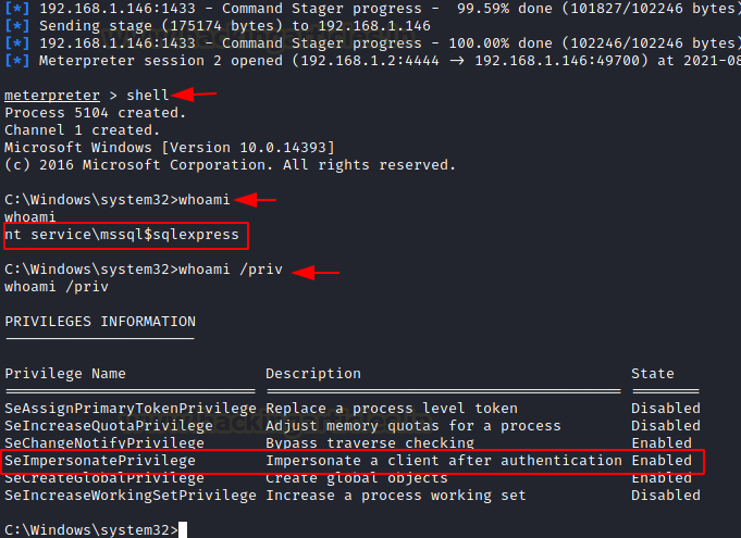Когда у пользователя есть сеанс meterpreter, он может перейти в Shell и посмотреть, какие привилегии есть у него с помощью команды «whoami». С помощью команды «whoami /priv» можно также проверить, включена ли функция «Impersonate» или нет.