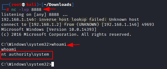 Как только пользователь получит сеанс netcat, он использует команду «whoami», чтобы проверить, что у него есть доступ к authority\system.