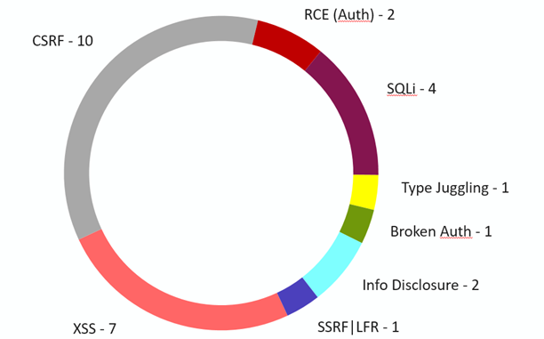 Большинство выявленных уязвимостей были обнаружены в административном интерфейсе (75%), но их эскалация через CSRF приводила к серьезному импакту. Уязвимостей степени High/Critical составило 60%. Наиболее опасные, не требующие аутентификации (а их 20% об общего числа), позволяли осуществить SQL-инъекцию и обойти аутентификацию, в том числе были найдены векторы, позволяющие загрузить shell-код через форму загрузки при наличии условий обхода аутентификации. Такие связки уязвимостей приводят к полной компрометации CMS и сервера.