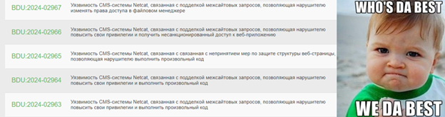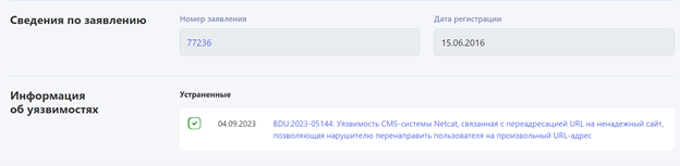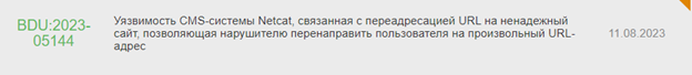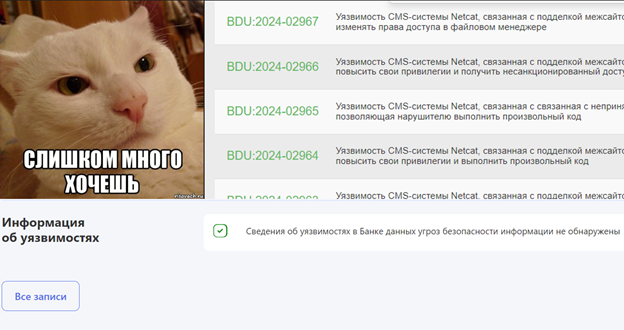 Тут на помощь приходит еще один источник информации – БДУ ФСТЭК России. Именно на него ссылается реестр. Обратившись на момент начала исследования к банку данных по упомянутому выше продукту Netcat CMS, я увидел всего одну уязвимость, связанную с открытым перенаправлением. Но даже ее не было в списках уязвимостей в реестре.