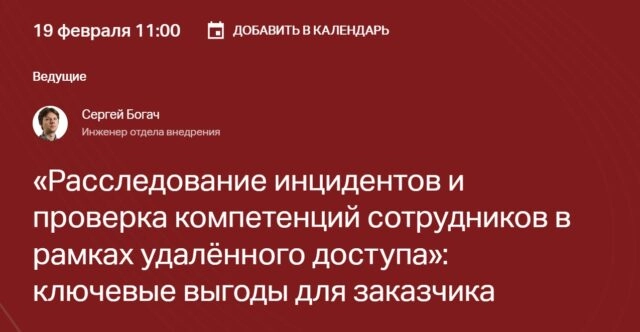 Вебинар о расследовании инцидентов, контроле удалённых сессий и проверке компетенций сотрудников на реальных кейсах.
