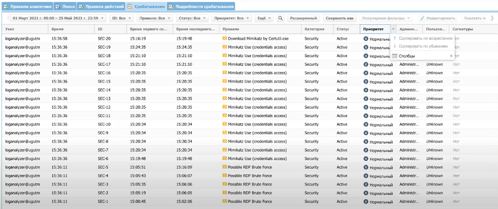 Поступающие события автоматически проверяются на соответствие встроенным правилам UserGate Log Analyzer, и при совпадении создаётся срабатывание.