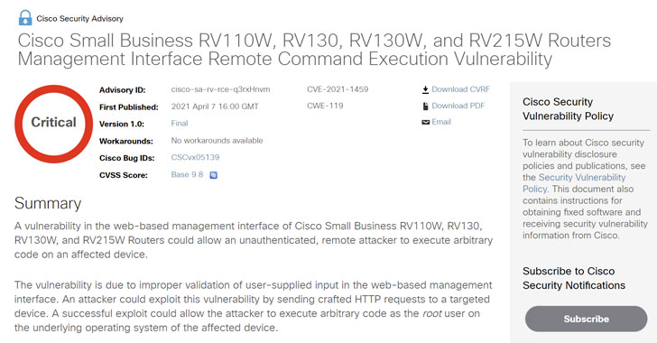 Речь идет об уязвимости CVE-2021-1459, которая имеет рейтинг CVSS 9,8/10. Она актуальна для брандмауэра RV110W VPN, маршрутизаторов Small Business RV130, RV130W и RV215W. При ее эксплуатации киберпреступники, не прошедшие проверку подлинности, могут удаленно выполнять произвольный код на уязвимом устройстве.