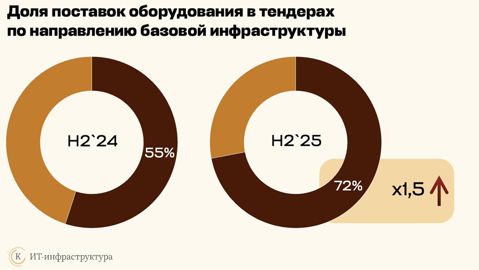 Ключевое изменение связано с типом закупаемых решений. Если раньше значительная часть тендеров нефтегазохимической отрасли приходилась на комплексные проекты внедрения и замещения зарубежных ИТ-систем, то во второй половине 2025 года компании сконцентрировались на закупках аппаратных решений. Доля поставок серверов, СХД, стоек и запасных частей выросла с 55% в 2024 году до 72% в 2025 году — почти в 1,5 раза год к году.