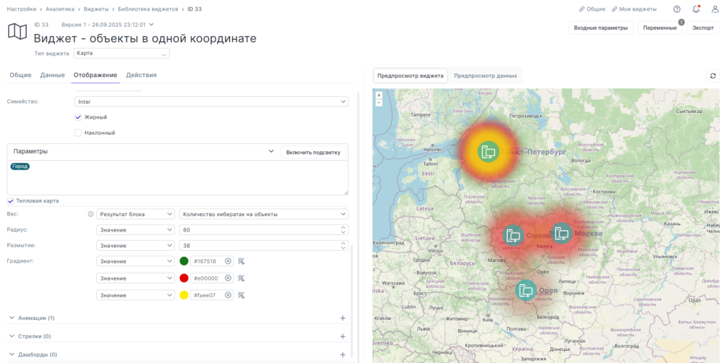 В виджете «Карта» появилась тепловая карта — можно отображать интенсивность, частоту и количество событий (например, кибератак и инцидентов) по ИТ‑объектам. В виджете «Последовательность (Timeline)» появились настраиваемые формы вывода для параметров, используемых при отображении данных.