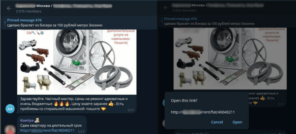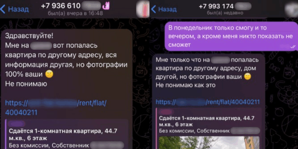 Второй способ распространения фишинговых ссылок – целевая атака на собственников жилья, разместивших объявления о продаже или аренде недвижимости. Для связи с ними мошенники используют подставные аккаунты. Под видом потенциальных покупателей или арендаторов злоумышленники связываются с собственниками, переписываются с ними в Telegram. Затем присылают сообщение: «Мне попалась квартира по другому адресу, вся информация другая, но фотографии ваши. Не понимаю». Сообщение сопровождает ложная ссылка, которая отображается как ссылка на легитимный сервис. Дальнейший сценарий перехвата доступа к личному кабинету сервиса повторяет описанный выше.