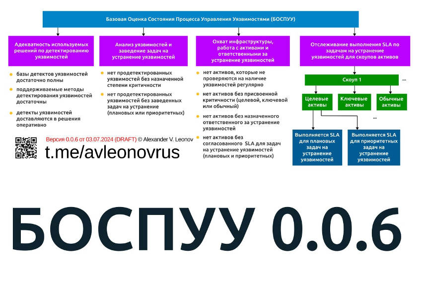 Как и способов приоритизации уязвимостей, способов оценки эффективности процесса управления уязвимостями существует много. Как мне кажется, среди них нет единственно правильного. Если уязвимости в инфраструктуре своевременно исправляются, аудиторы вас нахваливают, а пентестеры грустят, значит, всё нормально. Но некоторые свои соображения я формулирую под названием БОСПУУ (Базовая Оценка Состояния Процесса Управления Уязвимостями (рис. 1)). Я придерживаюсь того, что важно не зацикливаться на каких-то конкретных кейсах выявления и исправления уязвимостей, а смотреть, есть ли за этим нормальный функционирующий процесс с точки зрения: