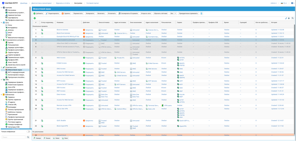 Помимо функций безопасности, UserGate DCFW поддерживает стандартные для межсетевых экранов сетевые функции: