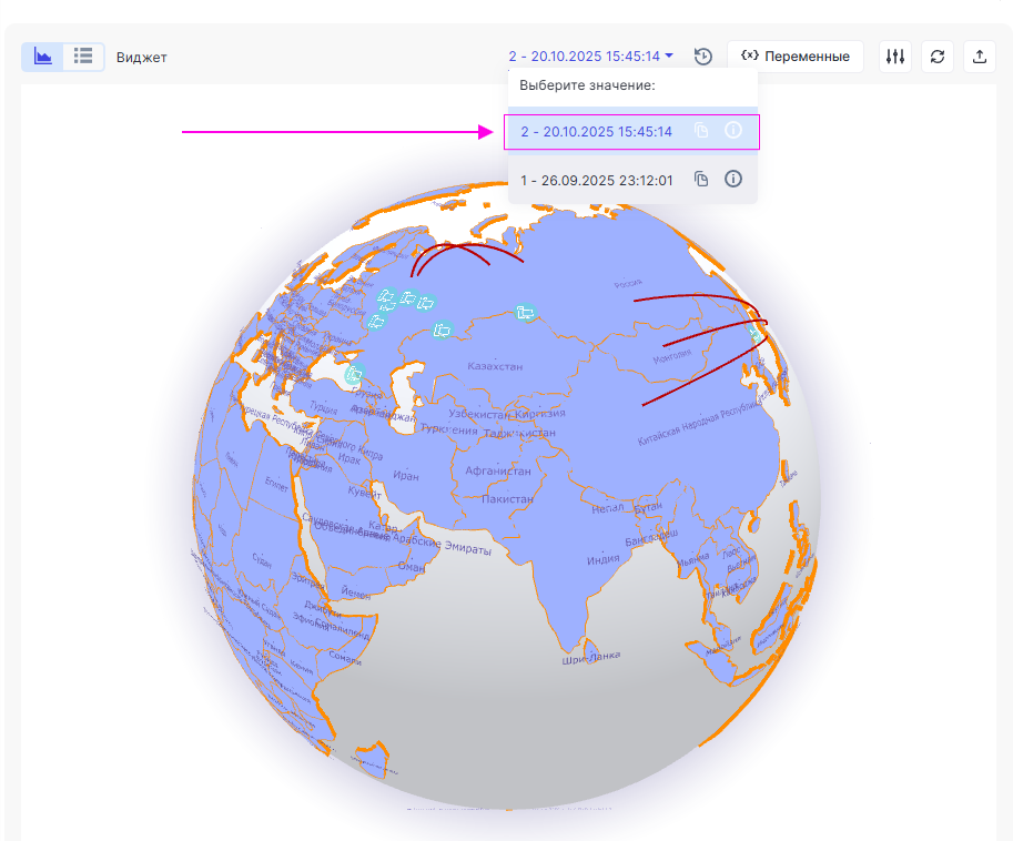 В платформе появилось версионирование виджетов — при добавлении в дашборды, отчёты и карточки автоматически используется последняя версия. Для популярных типов («Линейный график», «Столбчатая диаграмма», «Радар», «Карта», «Глобус») можно брать результат блока как источник данных переменной — это упрощает составные расчёты и повышает гибкость визуализаций. Добавлены новые преобразования переменных: сдвиг дат (включая начало/конец недели и месяца) и кодирование/декодирование Base64.