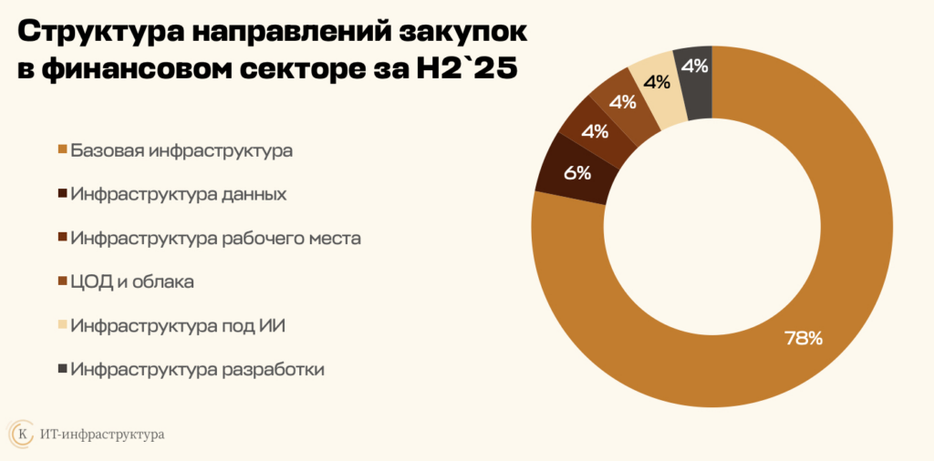 Если рассмотреть структуру закупок во втором полугодии 2025 года, то решения для базовой инфраструктуры занимают 78% всех закупок, инфраструктура данных — 6%, решения для рабочих мест и для ЦОД и облаков — по 4% каждая, инфраструктура под ИИ и разработки — по 4% соответственно.