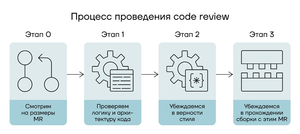 В рамках данного шага хочу акцентировать своё внимание на том, что код-ревью должно затрагивать стратегию фиксации изменений, наименования веток, способность разработчика ориентироваться в управлении репозиторием стандартными средствами (git). Например, разработчик может коммитить слишком большие куски кода сразу, что приводит к усложнению ревью и невозможности отменить конкретные элементы средствами встроенной команды git revert. В данном случае будет полезно напомнить о необходимости коммитить «пошагово», а не всё сразу, с объяснением причин данного требования.