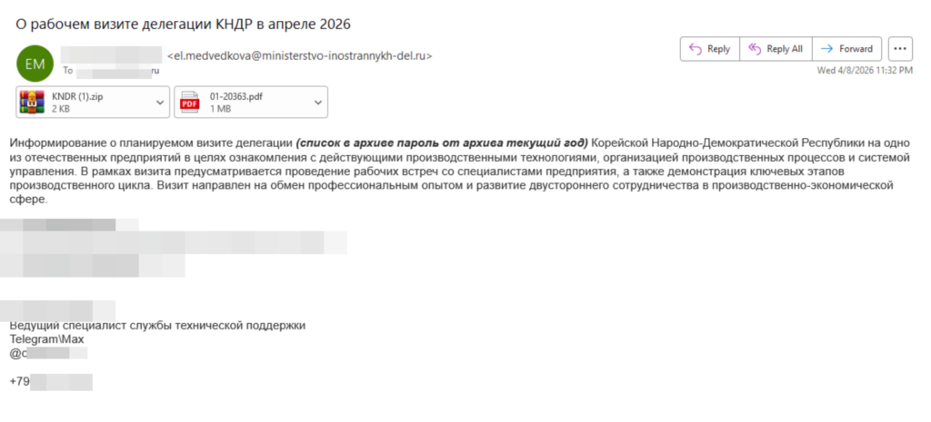 Письмо направлено с домена ministerstvo-inostrannykh-del[.]ru, созданного 30 марта 2026 года, и маскируется под уведомление о рабочем визите делегации Корейской Народно-Демократической Республики. В тексте указано, что визит планируется «в целях ознакомления с действующими производственными технологиями», «обмена опытом» и «развития двустороннего сотрудничества». Письмо содержит файл-приманку в формате PDF и zip-архив KNDR (1), для открытия которого необходим пароль, указанный в тексте сообщения.